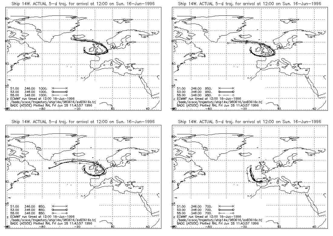 map for each pressure with the trajectories arriving at five
