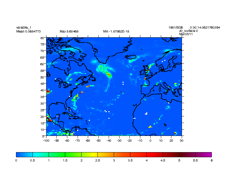 This movie shows the evolution of weather systems in the North Atlantic Storm Track. The images show the total precipitation rate (mm/hour) over the final five days of the current HiGEM simulation. The series of images demonstrates the ability of the HiGEM model to capture the evolution (birth, growth and decay) of weather systems in the North Atlantic storm track.
