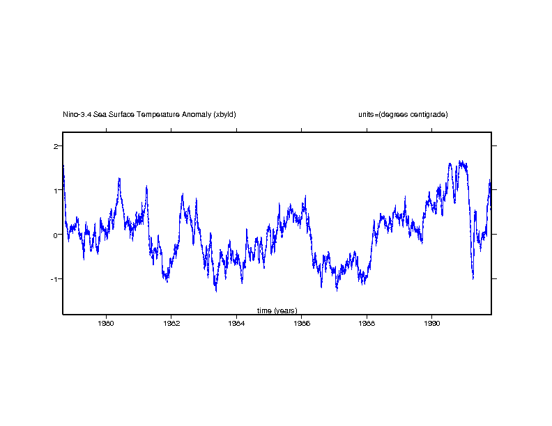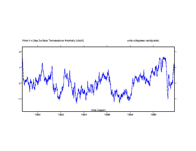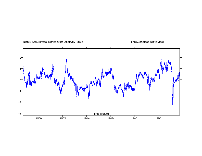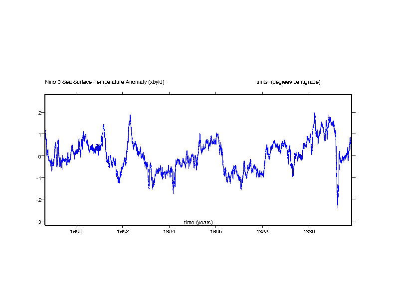 Nino-3 SST anomaly. Eastern equatorial pacific: 5N-5S x 150W-90W (degrees centigrade) gif ps |