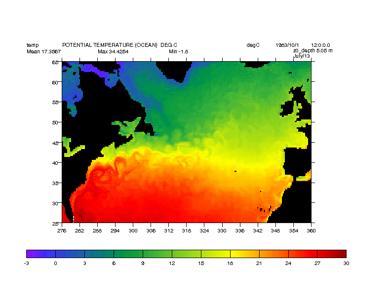 The Gulf Stream movie shows the evolution of the North Atlantic sea surface temperature (SST) in the final month of the current HiGEM simulation. The series of images demonstrates the ability of the HiGEM model to capture the evolution of the gulf stream eddies that form along the sharp SST gradient in the North Atlantic.