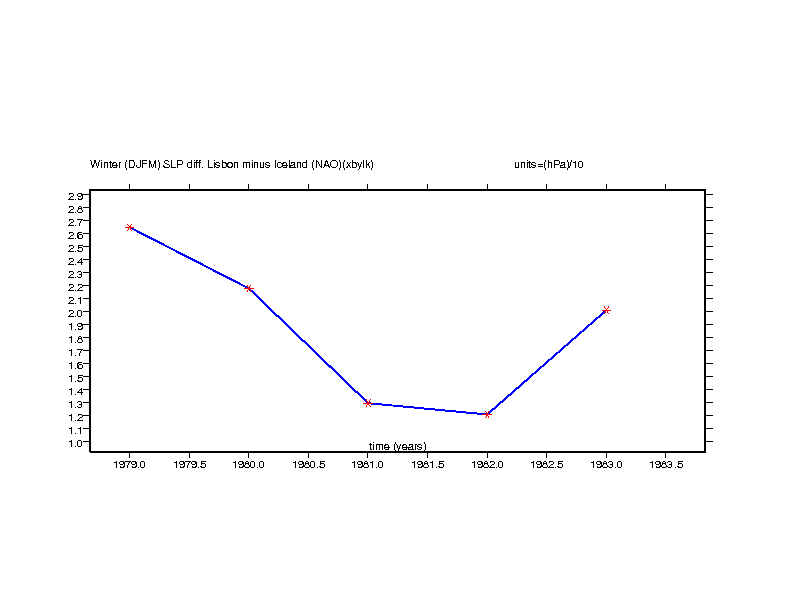 The SLP data presented here are NOT normalised if the length of the simulation is less than 10 years. Instead the time series plot simply shows the difference in pressure between Lisbon and Iceland.
