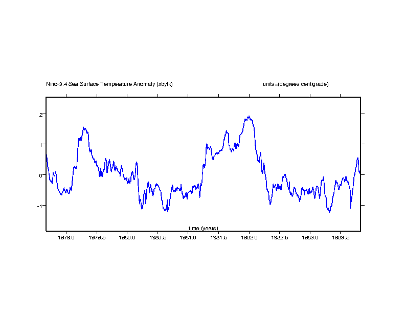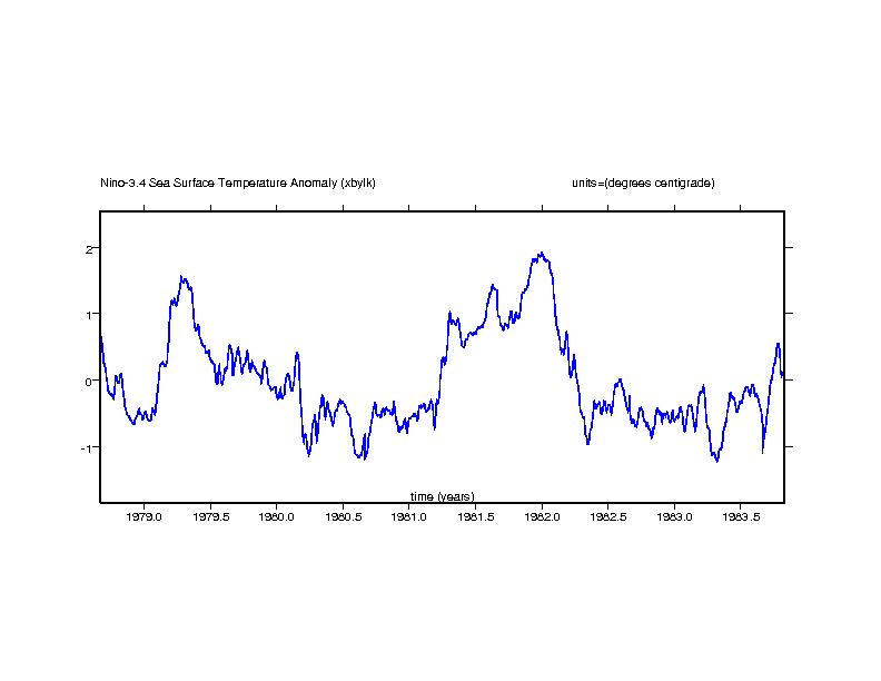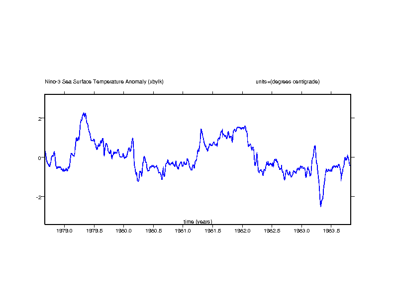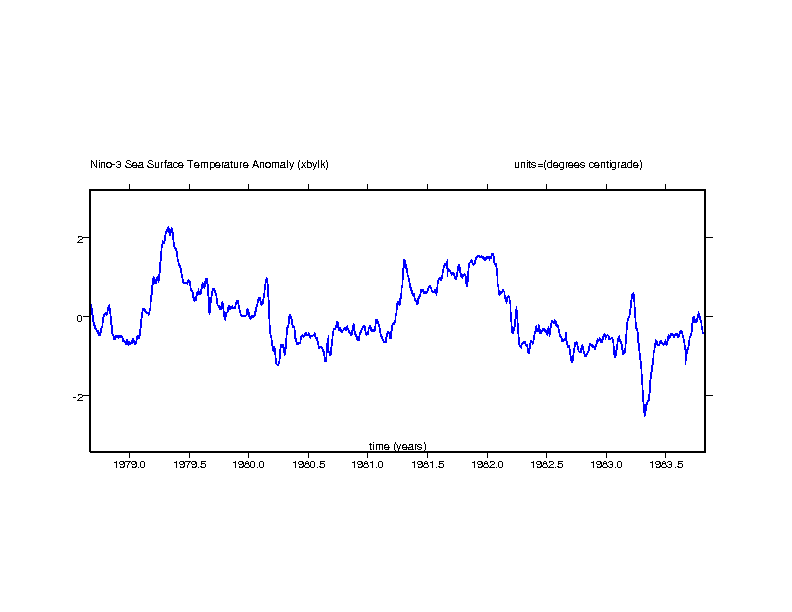 Nino-3 SST anomaly. Eastern equatorial pacific: 5N-5S x 150W-90W (degrees centigrade) gif ps |