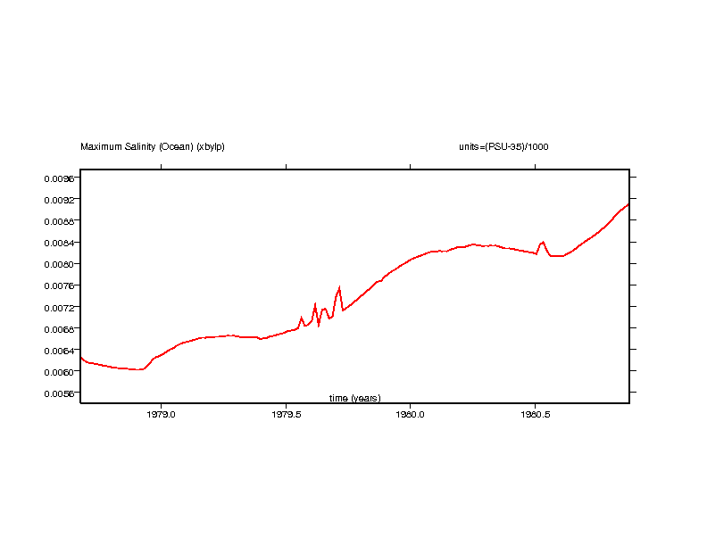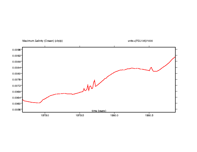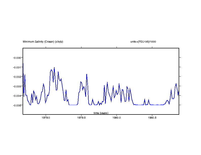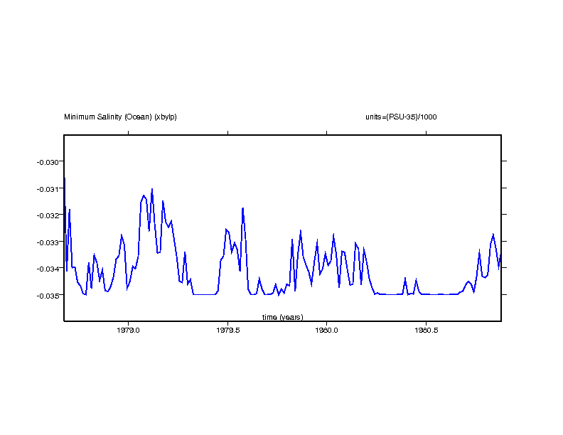 These time series plots show the salinity value in the ocean grid box with the maximum salinity and the salinity value in the ocean grid box with the minimum salinity.
