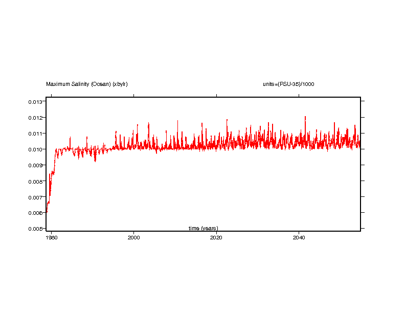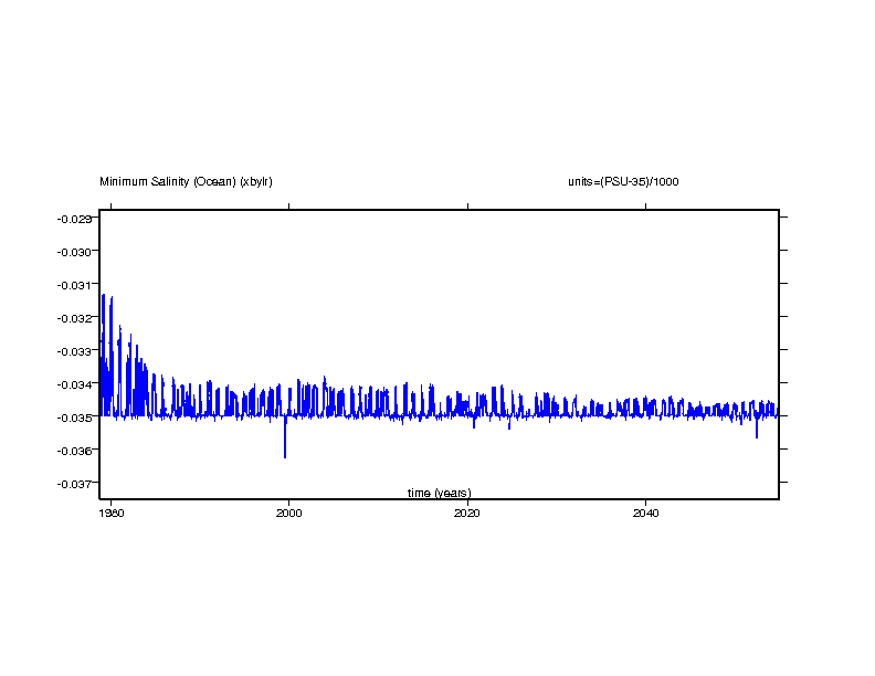 These time series plots show the salinity value in the ocean grid box with the maximum salinity and the salinity value in the ocean grid box with the minimum salinity.