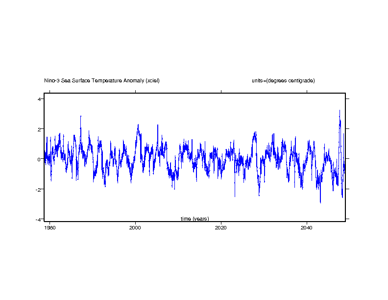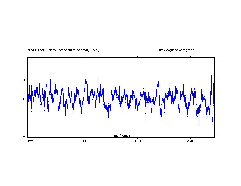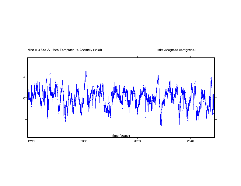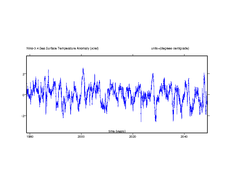 The El Nino Southern Oscillation (ENSO) is represented here by the Nino-3 and Nino3.4 sea surface temperature anomalies. The Nino-3 region is in the eastern equatorial Pacific bounded by the latitude 5S and 5N and the longtudes 150W and 90W. An anomalous increase of sea surface temperature indicates the onset of an el Nino event. The Nino-3.4 region is an area of the equatorial Pacific bounded by the latitudes 5S and 5N and the longitudes 170W and 120W. This is close to the region where sea surface temperature changes shift the pattern of regional rainfall.