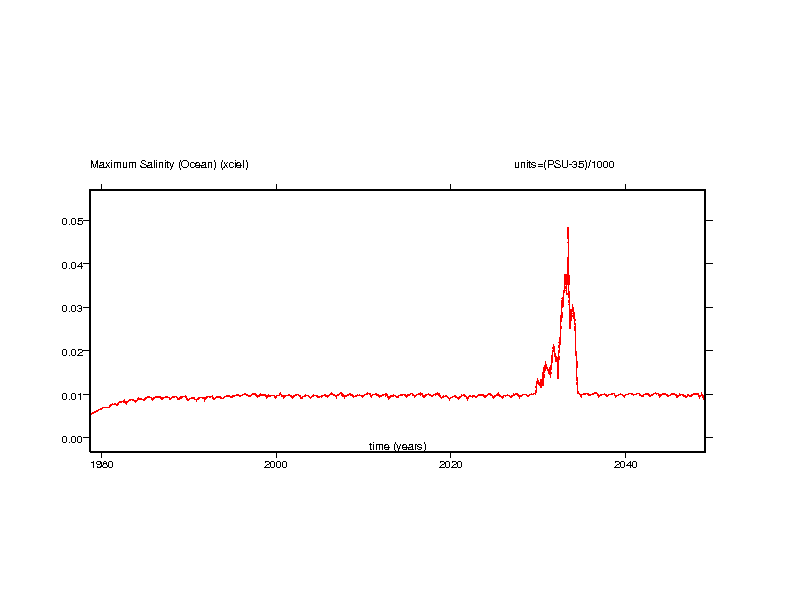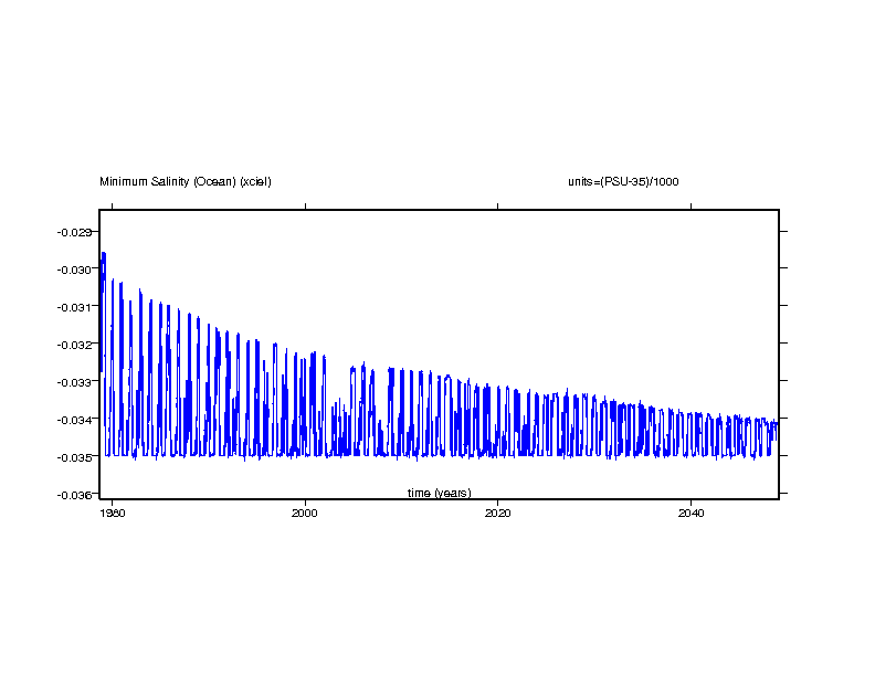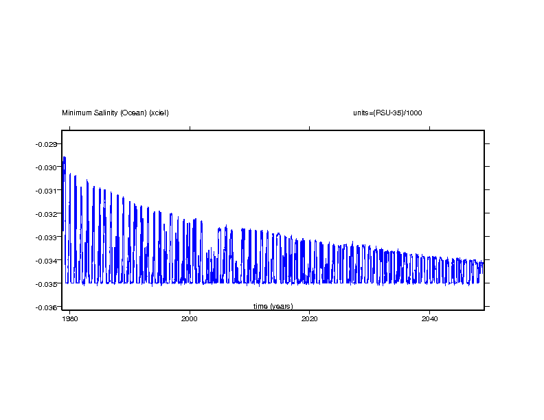 These time series plots show the salinity value in the ocean grid box with the maximum salinity and the salinity value in the ocean grid box with the minimum salinity.