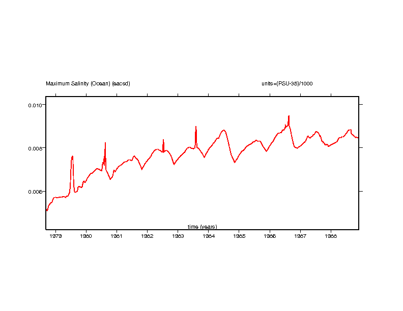 These time series plots show the salinity value in the ocean grid box with the maximum salinity and the salinity value in the ocean grid box with the minimum salinity.